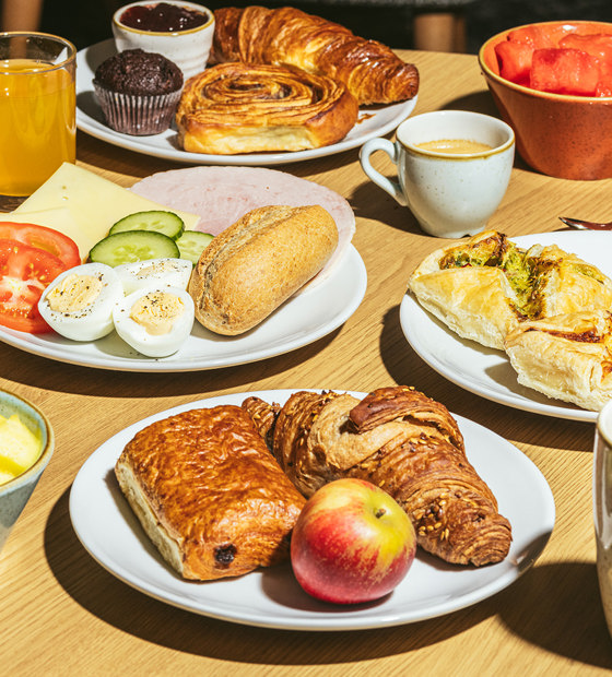 Our continental breakfast includes a selection of pastries, sweet and savoury, vegan and gluten-free options too. There is a choice of cereal and granola, yogurts, fresh fruit, and hard-boiled eggs. Rolls with butter, jam, cheese; juices, teas and coffees are also included. Breakfast is free when you book direct!