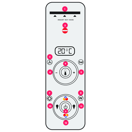 1. Insert Room Key: To operate or make any adjustments to the lighting or temperature please ensure your key card is inserted into the key panel socket and remains in place. Please allow up to 20 minutes for temperature adjustments to take full affect.